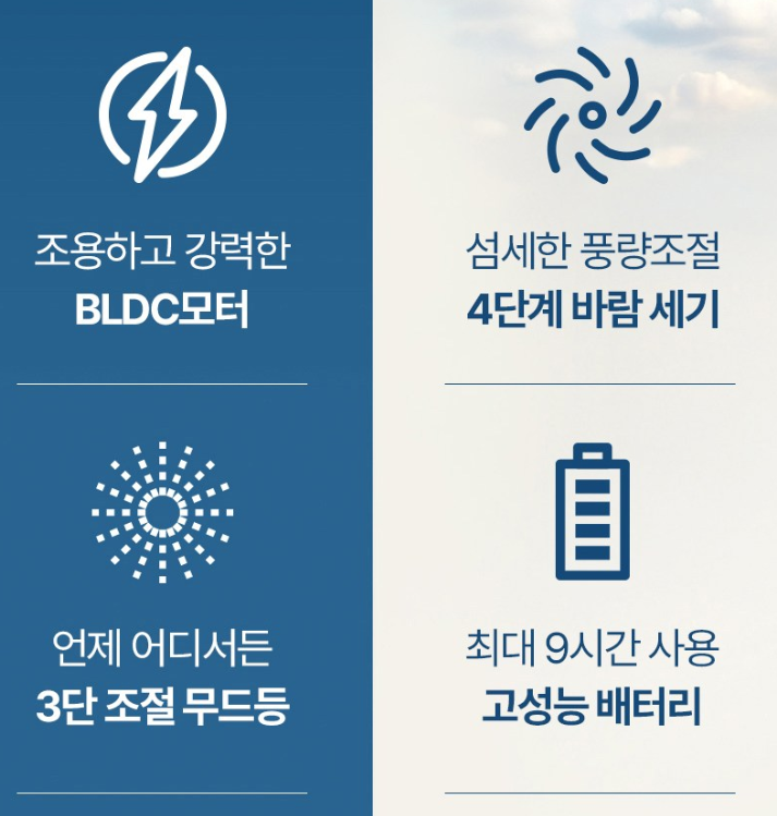 - BLDC 모터로 조용하면서도 강력한 바람! 밤에도 편안하게 사용 가능
